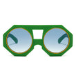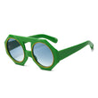 Women's Round Fashion Sunglasses. Chunky Geometric Oversized Green Plastic Frame Sunglasses Featuring Cut Out Bridge Design and Outlined Frame Detail. Gradient Color Tint PC Lens. UV 400. 100% UVA & UVB Protection. Frame Width: 146mm. Lens Width: 52mm. Lens Height: 52mm. Bridge Width: 24mm. Temple Length: 138mm.