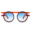 Women's Round Sunglasses. Irregular Futuristic Round Orange with Purple Plastic Double Frame Sunglasses Featuring Square Gradient Color Tint PC Lens. UV 400. 100% UVA & UVB Protection. Frame Width: 144mm. Lens Width: 42mm. Lens Height: 42mm. Bridge Width: 20mm. Temple Length: 140mm.