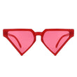 Women's Irregular Fashion Sunglasses. Modern Triangle Shaped Red Plastic Oversized Sunglasses Featuring Pointed Frame. Color Tint PC Lens. UV 400. 100% UVA & UVB Protection. Frame Width: 140mm. Lens Width: 54mm. Lens Height: 45mm. Bridge Width: 18mm. Temple Length: 139mm.