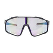 Women's One Piece Shield Sport Sunglasses. Black with Blue and Pink Paint Splatter Plastic Frame Sport Sunglasses Featuring One Piece Shield Purple Mirror Lens and Royal Blue Rubber Nose Pad. Royal Blue Rubber Nose Pad and Royal Blue Rubber Inlay in Side Arms for Non Slip Grip. Bottom of Lens Features Cut Out Design for Ventilation. PC Material. UV 400 Protection. Blocks 100% UVA & UVB. Temple to Temple Width 7". Length 2.35".