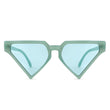 Women's Irregular Fashion Sunglasses. Modern Triangle Shaped Sea Green Plastic Oversized Sunglasses Featuring Pointed Frame. Color Tint PC Lens. UV 400. 100% UVA & UVB Protection. Frame Width: 140mm. Lens Width: 54mm. Lens Height: 45mm. Bridge Width: 18mm. Temple Length: 139mm.