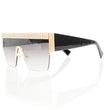 Women's Sunglasses Shield Oversized Square One Piece Lens Sunglasses. Gold Metal and Black Plastic Side Arm with Gray Black Gradient Lens and Pave Rhinestone Brow Line Detail. PC Material. UV 400 Protection. Blocks 100% UVA & UVB. Lens Width 6". Lens Length 2.25".
