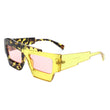 Women's Square Fashion Sunglasses. Irregular Square Flat Top Futuristic Two-Tone Yellow and Tortoiseshell Plastic Frame Sunglasses Featuring Wide Side Arm. Color Tint PC Lens. UV 400. 100% UVA & UVB Protection. Frame Width: 148mm. Lens Width: 51mm. Lens Height: 27mm. Bridge Width: 22mm. Temple Length: 145mm.