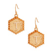 Gold Metal Fish Hook Earrings Featuring T Hexagon Initial Charm Detail. Charm measures .65 inches wide