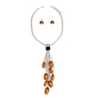Women's Tassel Necklace Set. Rustic Earthy Silver Metal Mesh Chain Necklace Set Featuring Drop Tassel Comprised of Black Leather Cord and Elongated Natural Brown Wooden Beads. Tassel Measures 9" Long. Tribal Design. Silver Metal Lobster Clasp Closure. Includes Matching Fish Hook Bead Drop Earrings.