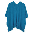 Teal Crochet Patterned Knit Poncho Featuring V Neck, Tiered Sleeve and Fringe Detailing. 100% Acrylic. One Size. Soft Knit Sweater Feel Material.