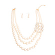 Indulge in luxury with our Gold Metal and 3 Strand Graduated Cream Pearl Layered Necklace Set, a statement piece that exudes elegance. This set features designer-inspired clear crystal rhinestone infinity rings, measuring a stunning 3.15 inches long and 2.25 inches wide, adding a touch of opulence to your neckline.