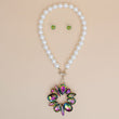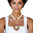 Women's Toggle Pearl Necklace Set. Lustrous Oversized Acrylic Cream Pearl Toggle Closure Necklace Featuring Large Round Ring Drop Pendant Comprised of Gold Metal with Assorted Shape Mixed Pink and Green Crystals. Striking Centerpiece Pendant. Pendant Measures 4.25" x 3.25". Pearls Measure 16mm. Includes Round Rhinestone Stud Post Backing Earrings.