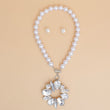 Women's Toggle Pearl Necklace Set. Lustrous Oversized Acrylic White Pearl Toggle Closure Necklace Featuring Large Round Ring Drop Pendant Comprised of Silver Metal with Assorted Shape Clear Crystals. Striking Centerpiece Pendant. Pendant Measures 4.25" x 3.25". Pearls Measure 16mm. Includes Round Rhinestone Stud Post Backing Earrings.