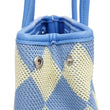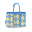 Women's Top Handle Handbag. Nostalgic but Fresh Small Blue Faux Vegan Leather Square Top Handle Handbag Featuring Dual Side Knit Harlequin Print Detail. Snap Closure. Includes Detachable Adjustable Shoulder Strap.