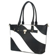 Women's Tote Handbag Black and White Vegan Faux Leather Soft Pebble Grain Tote Style Shoulder Bag Featuring Wavy Stripe Design and Gold Metal Lock Detail. Main Zipper Closure. Rear Zipper Pocket. Long Detachable Crossbody Strap Included.