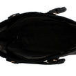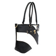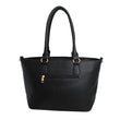 Women's Tote Handbag Black and White Vegan Faux Leather Soft Pebble Grain Tote Style Shoulder Bag Featuring Wavy Stripe Design and Gold Metal Lock Detail. Main Zipper Closure. Rear Zipper Pocket. Long Detachable Crossbody Strap Included.