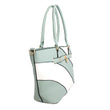 Women's Tote Handbag Light Green and White Vegan Faux Leather Soft Pebble Grain Tote Style Shoulder Bag Featuring Wavy Stripe Design and Gold Metal Lock Detail. Main Zipper Closure. Rear Zipper Pocket. Long Detachable Crossbody Strap Included.