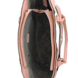 Women's Tote Handbag Light Pink and White Vegan Faux Leather Soft Pebble Grain Tote Style Shoulder Bag Featuring Wavy Stripe Design and Gold Metal Lock Detail. Main Zipper Closure. Rear Zipper Pocket. Long Detachable Crossbody Strap Included.