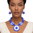 Women's Tribal Bead Necklace Set. Royal Blue Plastic Resin Buffalo Horn Shaped Beaded Necklace Featuring Marbled Brown Stripe Detailing, Square Beads, and Royal Blue with Marbled Brown Resin Round Disc Pendant. Pendant Disc Measures 2.5". Horn Shaped Beads Measure 4" long. Lobster Clasp Closure. Includes Matching Fish Hook Ball Bead Drop Earrings.