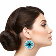 Gold Metal Fish Hook Earrings Featuring Round Leather Boho Turquoise Sunburst Pattern Detail. Gray Backing. Earrings measure 1.65 inches wide