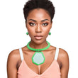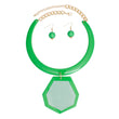 Women's Pendant Necklace Set 80's Retro Style Matte Green Acrylic Rigid Collar Featuring Linked Geometric Pendant with Light Green Coloring. Pendant measures 3" x 3". Gold Metal Chain Lobster Clasp Closure. Includes Matching Fish Hook Ball Bead Drop Earrings.