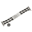 Women's Watch Band. Silver Metal Chain Watch Band Woven with Black Vegan Leather Featuring Black Epoxy Camellia Charm. Fits 38. 40. 41 mm. Easy Adjustable Sizing. Band measures .85" wide. Charm measures .75" wide. Watch Band Closure.