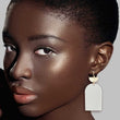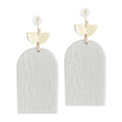 Gold Metal Fish Hook Bridal Earrings Featuring White Clay Rounded Rectangle Drop with Floral Stamp Detail. Earrings measure 1 inch wide.