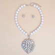 Women's Pearl Pendant Necklace Set. Playful Yet Polished Lustrous Oversized Acrylic White Pearl Necklace Featuring Large Chunky Silver Metal Palm Leaf Pendant. Pendant Measures 4.25" x 3.2". Pearls Measure 16mm. Lobster Clasp Closure. Includes Domed Stud Post Backing Earrings.