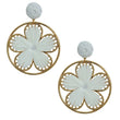 White Raffia and Gold Metal Round Drop Earrings Featuring Flower Detail. Earrings measure 1.85 inches wide.