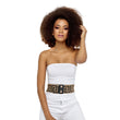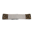 Women's Wide Belt. Black and Gold Metallic Stretch Canvas Belt Featuring Greek Key Lettering and Rhinestone Detail. Vegan Leather and Gold Metal Snap Closure. Belt measures 2.5" wide and 26" long when unstretched. Rhinestone Detailing measures 5" long.