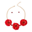 Gold Chain with Wine Fabric Flowers Featuring Metal, Bead, and Rhinestone Details. Flowers measure 2.25 inches