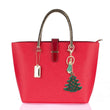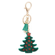 Gold Metal Keychain Ring and Handbag Charm Clip Featuring Tassel Plus Green and Red Rhinestone Padded Christmas Tree Charm. Padded Xmas Tree measures 3" x 2.6". Felt Backing.