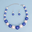 Zeta Phi Beta Sorority Paraphernalia Women's Pearl Necklace Set. Single Strand Blue and White Acrylic Graduated Bubble Gum Pearl Necklace Set. Neckline Pearls Measures 15.5mm. Center Pearls Measure 30mm. Silver Metal Lobster Clasp Closure. Includes Matching Fish Hook Double Pearl Drop Earrings.