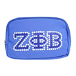 Zeta Phi Beta Sorority Paraphernalia Women's Crossbody Bag. Blue Canvas Fabric Crossbody or Fanny Pack Waist Bag Featuring ZPB White Pearl and Blue Rhinestone Stud Detail. Main Zipper Closure. Rear Zipper Pocket. Interior Features 4 Mesh Pockets. Adjustable Blue Canvas Strap.