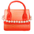 Red Ombre Crocodile Vegan Leather One Handle Satchel Handbag Featuring Flap and Snap Closure. Includes Matching Adjustable Crossbody Shoulder Strap with Cream Pearl and Rhinestone Spacer Detailing